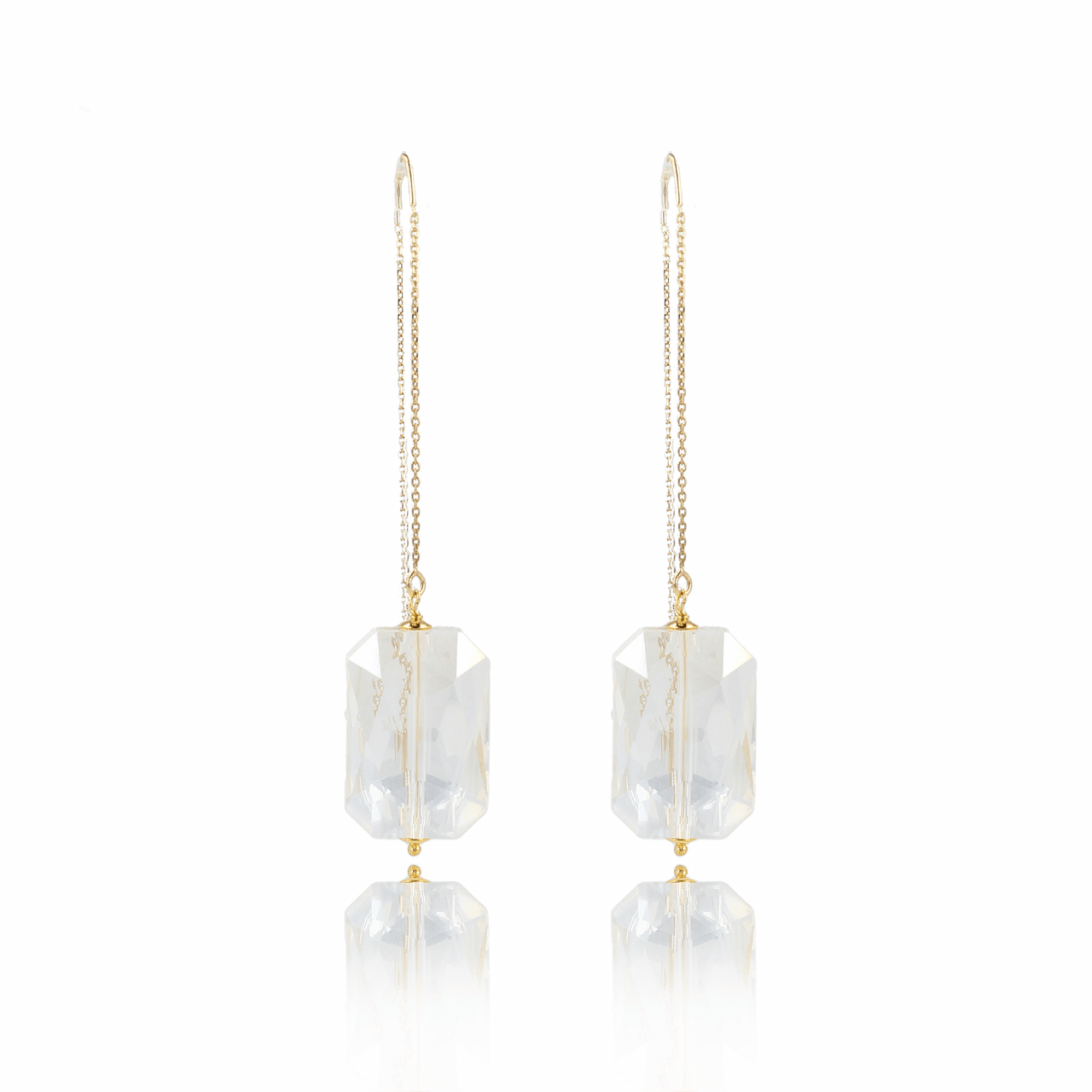 De combinatie van kristalheldere kwarts met een fijne hanger maakt het tot een klassieke, opmerkelijke oorbel. Door het gouden boogje aan de steker blijft die altijd mooi hangen in je oor.