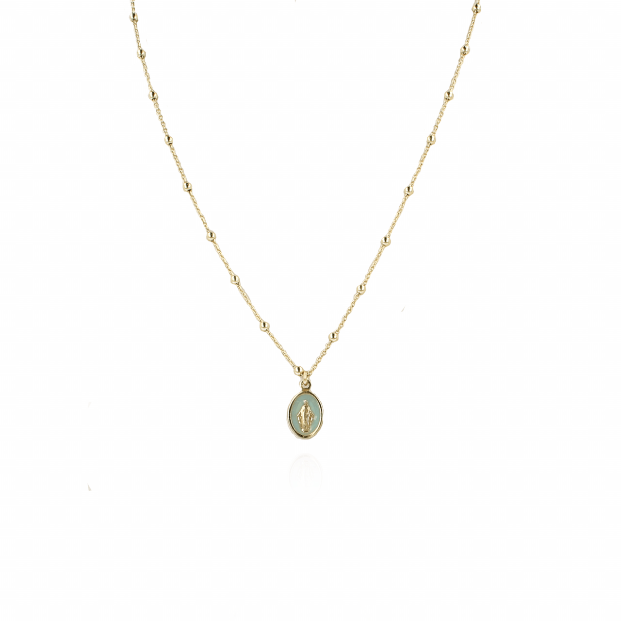 Deze gouden ketting met lichtblauwe Madonna Symbool geeft een verrassende en verfrissende uitstraling door het gebruik van een zomerse, lichtblauwe kleur. Breng met deze ketting zomerse sferen in jouw look.