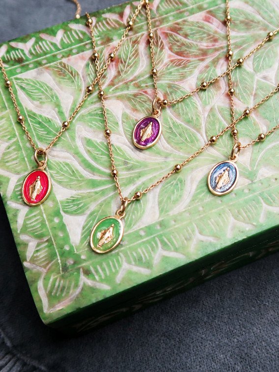 De gouden Madonna groen Ketting geeft je outfit een heerlijke zomerse touch door de combinatie van rijke kleuren. You deserve a LOTT.