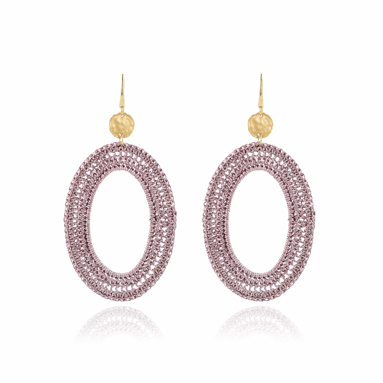 Voeg een extra dimensie toe aan je outfit. Een ovaal silk element met een roze finish. De oorbel wordt verlengd door een mooi afgewerkt hammerd element.